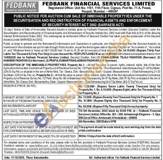 DESCRIPTION OF THE IMMOVABLE PROPERTY/IES. Property No.1: All that the piece or parcel, rights, interest, rights, title of the Non Agriculture Immovable Commercial Property out of Revenue Survey No. 7/2 Paiki, Shop No. 19on Basement, total Admeasuring 21-30 Sq Meter, 229-33 Sq. Fits je situated in the sim of Akhol Moti, Tal-Deesa, Dist-Banaskantha, State:-Gujarat. Measurements :- (Total Admeasuring 21-30 Sq.Meter, 229-33 Sq. Fits.i.e). Property No.2:- All that the piece or parcel, rights, interest, rights, title of the Non Agriculture Immovable Commercial Property out of Revenue Survey No. 7/2 Paiki, Shop No. 68 on Basement, total Admeasuring 24-47 Sq.Meter, 263-37 Sq. Fitsje situated in the sim of Akhol Moti, Tal:-Deesa, Dist-Banaskantha, State:-Gujarat. Measurements:- (Total Admeasuring 24-47 Sq Meter, 263-37 SqFitsie)