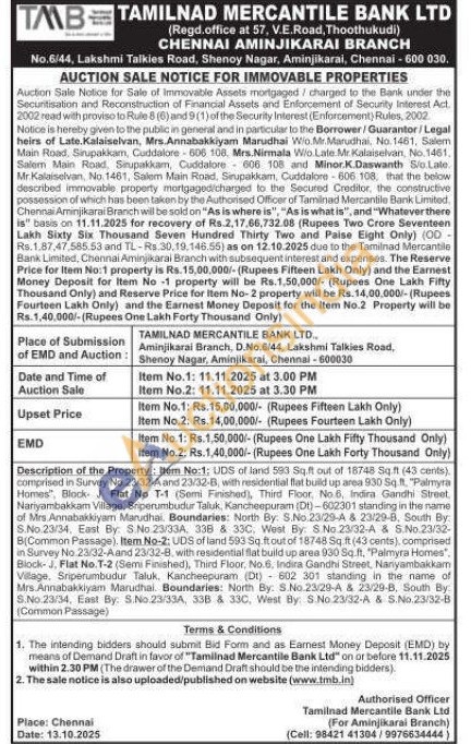 Flat No.T-2 (Semi Finished), Third Floor, No.6, Indira Gandhi Street, Nanyambakkam Village, Sriperumbudur Taluk. Kancheepuram (DI) 602 301 standing in the name of Mrs.Annabakkiyam Marudhai. Boundaries: North By. S.No.23/29-A & 23/29-B, South By: S.No 23/34, East By: S.No.23/334, 338 & 33C, West By S.No. 23/32-A & S.No.23/32-B (Common Passage)