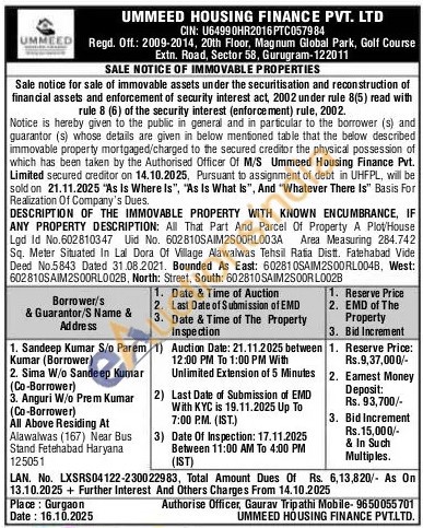 All That Part And Parcel Of Property A Plot House Lgd Id No.602810347 Uid No. 602810SAIM2S0ORLD03A Area Measuring 284.742 Sq. Meter Situated In Lal Dora Of Village Alawalwas Tehsil Ratia Distt. Fatehabad Vide Deed No.5843 Dated 31.08.2021. Bounded As East: 602810SAIM2500 RL0048, West: 602810SAIM2500RL0028, North: Street, South: 602810SAIM2500R L0028