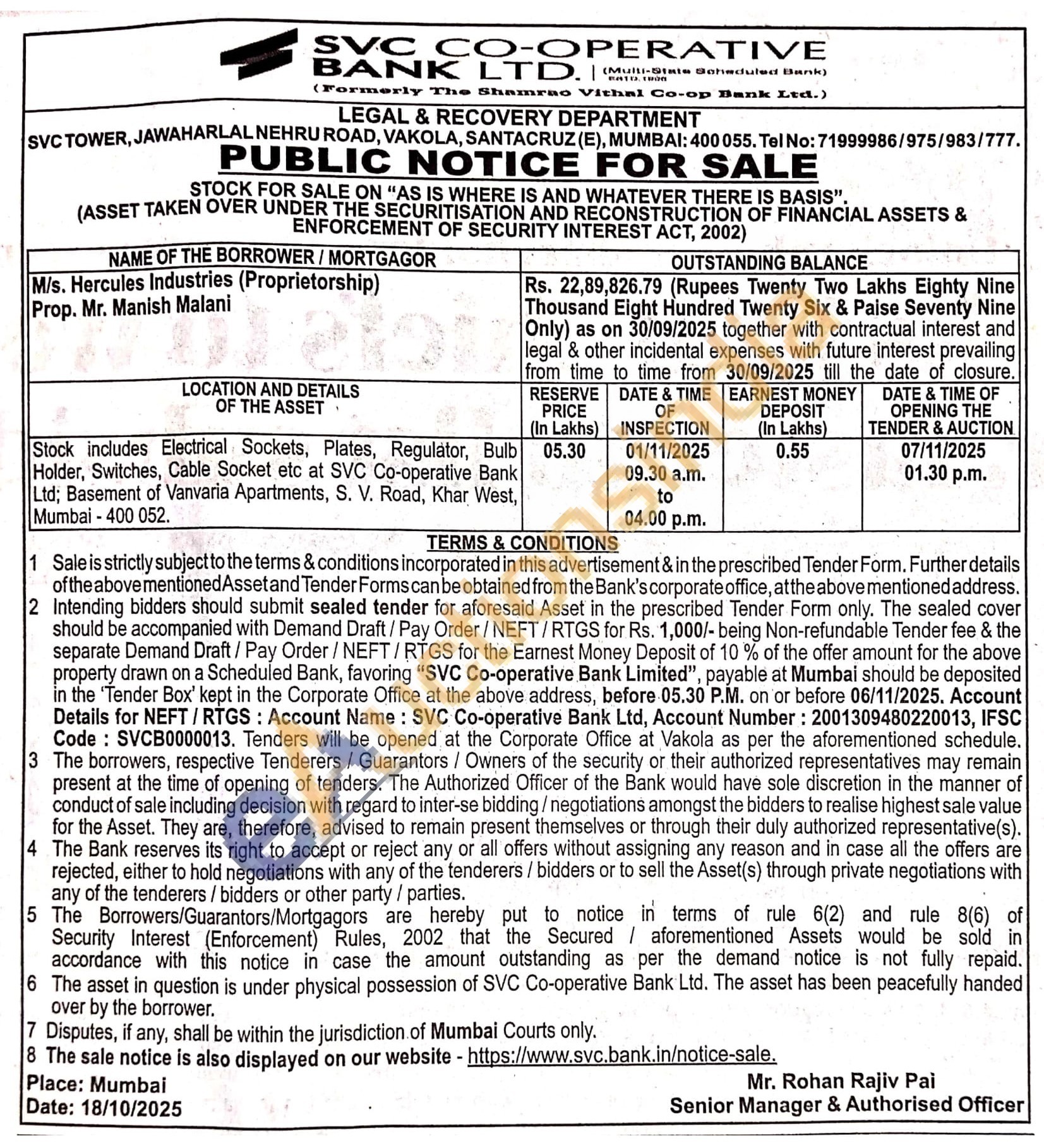Stock includes Electrical Sockets, Plates, Regulátor, Bulb Holder, Switches, Cable Socket etc at SVC Co-operative Bank Ltd; Basement of Vanvaria Apartments, S. V. Road, Khar West, Mumbai-400 052.