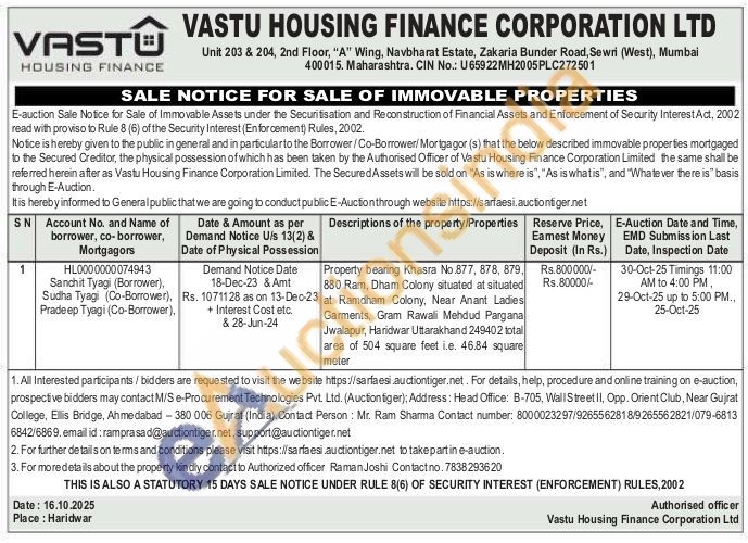Property bearing Khasra No.877, 878, 879, 880 Ram, Dham Colony situated at situated at Ramdham Colony, Near Anant Ladies Garments, Gram Rawali Mehdud Pargana Jwalapur, Haridwar Uttarakhand 249402 total area of 504 square feet i.e. 46.84 square meter