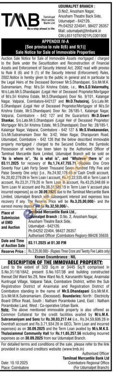 Land to the extent of 320 Sq.m or 3445 Sq.ft comprised in S.No.31/18/18A2, present S.No. 107/3B and building constructed thereat Old Ward No.29, New Ward No.9, Karunanithi Nagar, Anaimalai Kuntrugal Village, Valparai Taluk, Coimbatore District, within the Sub Registration District of Anaimalai and Registration District of Coimbatore standing in the name of Mr.S.Dhandapani S/o.Mr.M.Κ. S/o.Mr.M.K.Subramaniam. (Deceased). Boundaries: North: Electricity Board Office Road, South Natham Poramboke Land, East: Natham Poramboke Land, West: Co-operative Urban Bank.