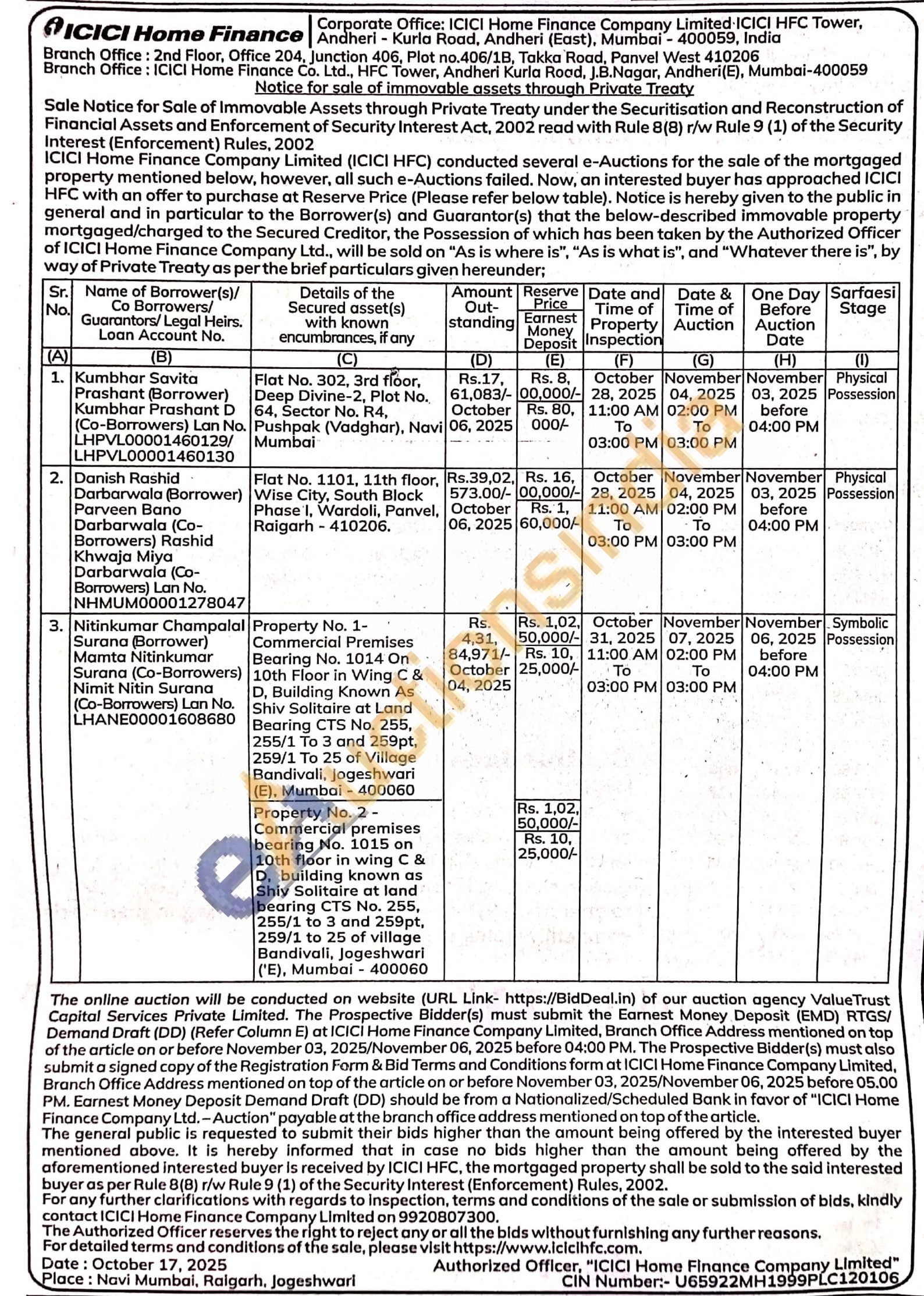 1) Flat No. 302, 3rd floor, Deep Divine-2, Plot No. 64, Sector No. R4, Pushpak (Vadghar), Navi Mumbai