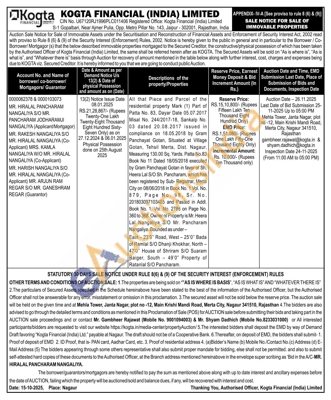 All that Piece and Parcel of the residential property Mark (1) Part of Patta No. 83, Dayar Date 05.07.2017 Misal No. 244/2017-18, Sankalp No. 03 dated 20.08.2017 issued in compliance on 18.05.2018 by Gram Panchayat Gotan, Situated at Village Gotan, Tehsil Merta, Dist. Nagaur. Measuring 130.00 Sq. Yards. Patta No.83 Book No 11 Dated 18/05/2018 executed by Gram Panchayat Gotan in favor of Sh. Heera Lal S/O Sh. Pancharam, which has been registered by Sub- Registrar, Merta City on 08/06/2018 in Book No. 1 Vol. No. 879, Page No. 98, Sr. No. 201803097103405 and Pasted in Addl. Book No. 1, Vol. No. 2786 on Page No. 360 to 368. Owner of Property is Mr. Heera Lal Nangaliya S/O Mr. Pancharam Nangaliya. Bounded as under-