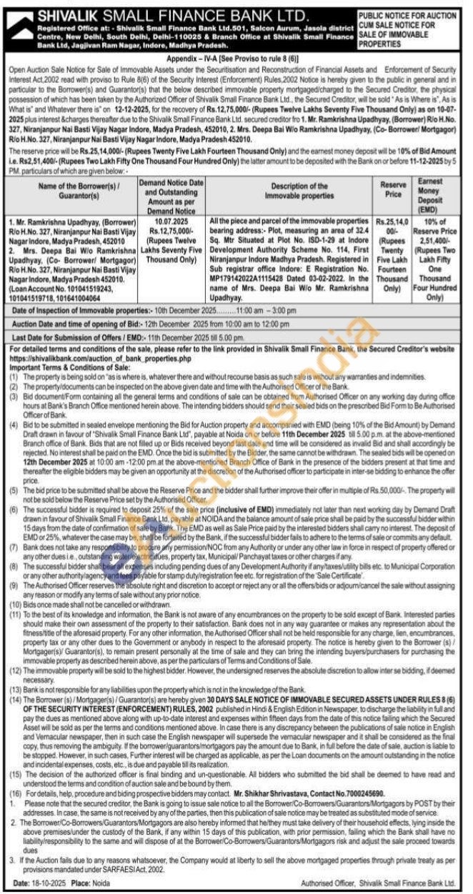 All the piece and parcel of the immovable properties bearing address:- Plot, measuring an area of 32.4 Sq. Mtr Situated at Plot No. ISD-1-29 at Indore Development Authority Scheme No. 114, First Niranjanpur Indore Madhya Pradesh. Registered in Sub registrar office Indore: E Registration No. MP179142022A1115428 Dated 03-02-2022. In the name of Mrs. Deepa Bai W/o Mr. Ramkrishna Upadhyay.