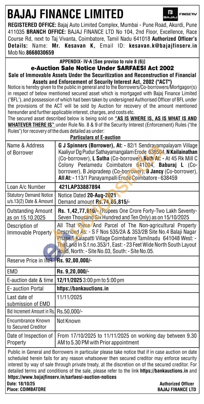 All That Piece And Parcel of The Non-agricultural Property Described As: - SF Nos 535/2A & 353/2B Site No.4 Balaji Nagar Phase 1 Kalapatti Village Coimbatore Tamilnadu 641048 West: -The Land In S.f.no.353/1, East: -23 Feet Wide North South Layout Road, North: - Site No.03, South: - Site No.05.