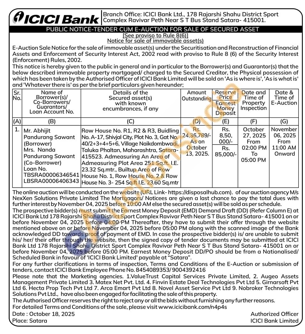 Row House No. R1, R2 & R3, Buidling No. A-17, Shivjal City, Plot No. 3, Gat No. 40/2+3+4+5+6, Village Naikdombwadi, Taluka Phaltan, Maharashtra, Satara-415523. Admeasuring An Area of Admeasuring Plot Area 251 Sq.ft. I.E. 23.32 Sq.mtr., Builtup Area of Row House No. 1, Row House No. 2 & Row House No. 3- 254 Sq.ft I.E. 23.60 Sq.mtr