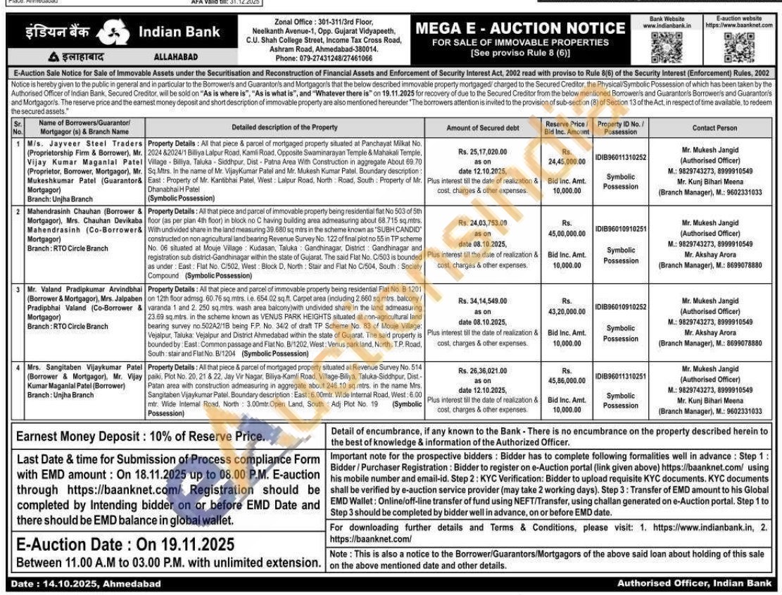 Property Details: Al that piece & parcel of mortgaged property situated at Panchayat Milkat No. 2024 82024/1 Biliya Lalpur Road, Kamli Road, Opposite Swaminarayan Temple & Mahakali Temple. Village - Billiya, Taluka Siddhpur, Dist-Patna Area With Construction in aggregate About 69 70 S; Mtes. In the name of Mr. Vijay Kumar Patel and Mr. Mukesh Kumar Patel. Boundary description: East: Property of Mr. Kantibhai Patel, West: Lalpur Road, North Road, South Property of Mr. Dhanabhai H Patel