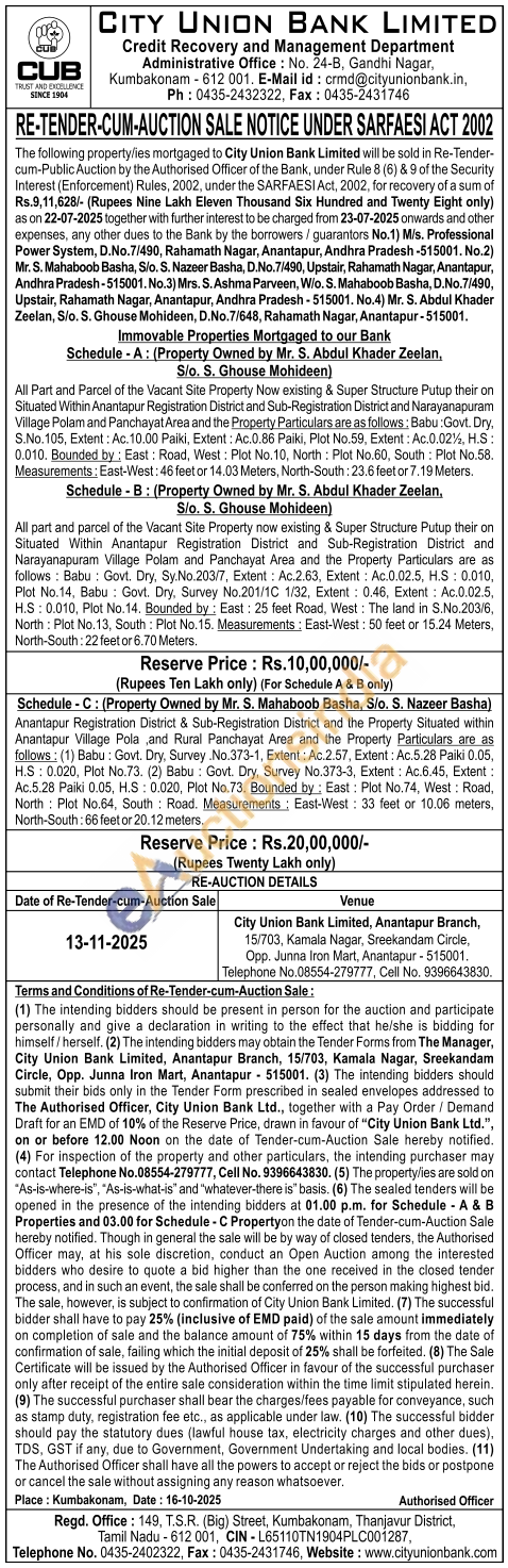All part and parcel of the Vacant Site Property now existing & Super Structure Putup their on Situated Within Anantapur Registration District and Sub-Registration District and Narayanapuram Village Polam and Panchayat Area and the Property Particulars are as follows: Babu Govt. Dry, Sy.No.203/7, Extent: Ac.2.63, Extent: Ac0.02.5, H.S: 0,010, Plot No.14. Babu Govt. Dry, Survey No.201/10 1/32, Extent: 0.46. Extent: Ac.0.02.5. H.S: 0.010, Plot No. 14. Bounded by: East: 25 feet Road, West: The land in S.No.203/8 North: Plot No:13. South: Plot No. 15. Measurements East-West: 50 feet or 15.24 Meters North-South: 22 feet or 6.70 Meters
