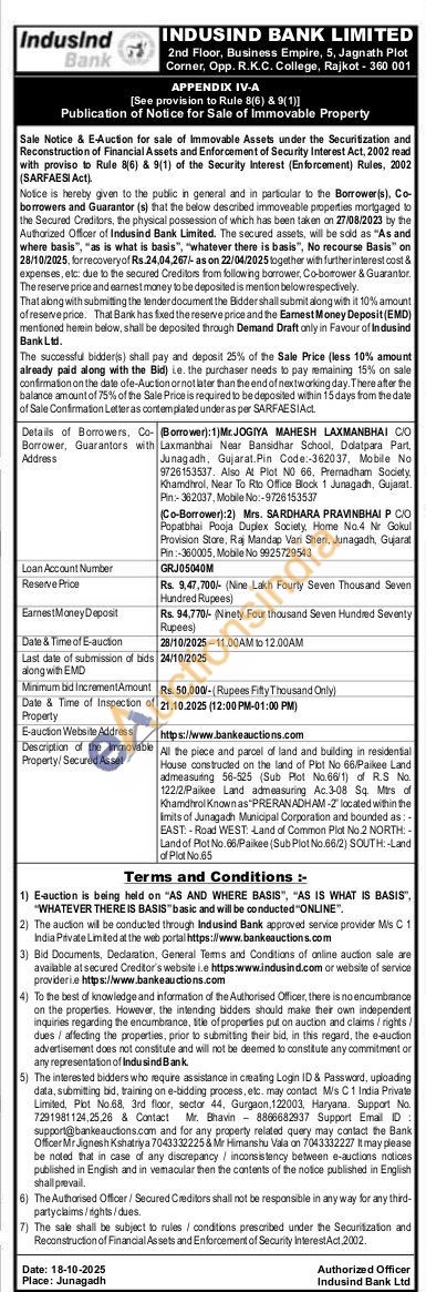 Al the piece and parcel of land and building in residential House constructed on the land of Plot No 66/Paikee Land atmeasuing 56-525 (Sub ub Plot No.66/1) of RS No. 122/2/Paikee Land admeasuring Ac.338 Sq. Mes of Khamdhral Known as PRERANADHAM-2 located within the limits of Junagadh Municipal Corporation and bounded as EAST-Road WEST: Land of Common Piat No.2 NORTH:-Land of Plot No.96/Paikee (Sub Plot No.66/2) SOUTH-Land of Plat No.65