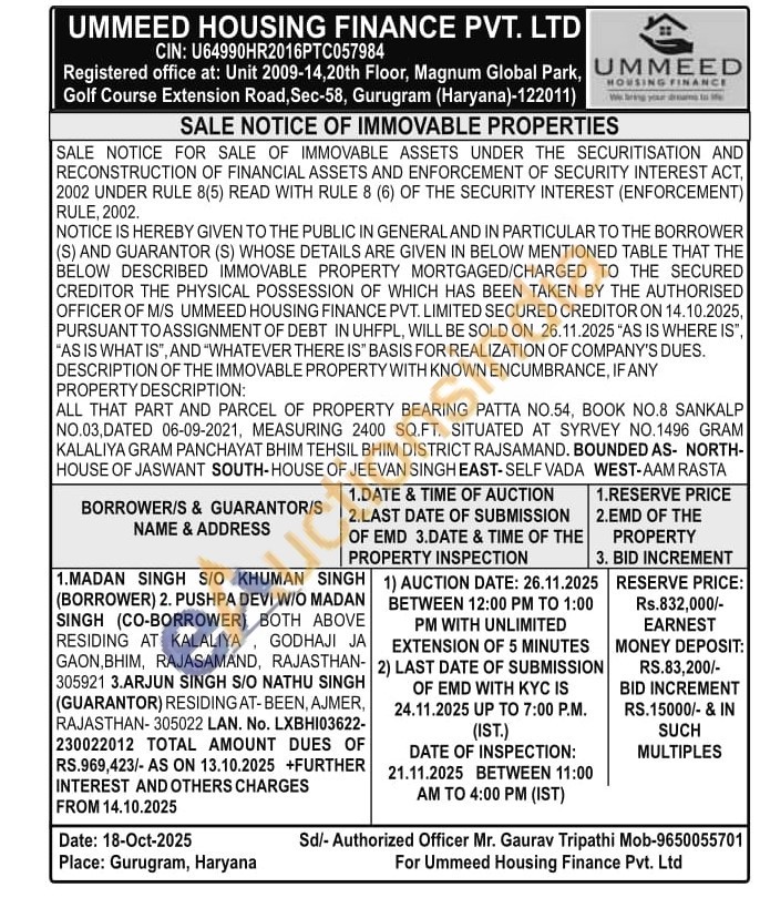 ALL THAT PART AND PARCEL OF PROPERTY BEARING PATTA NO.54, BOOK NO.8 SANKALP NO.03,DATED 06-09-2021, MEASURING 2400 SQ.FT. SITUATED AT SYRVEY NO.1496 GRAM KALALIYA GRAM PANCHAYAT BHIM TEHSIL BHIM DISTRICT RAJSAMAND. BOUNDED AS NORTH-HOUSE OF JASWANT SOUTH-HOUSE OF JEEVAN SINGH EAST-SELF VADA WEST-AAM RASTA