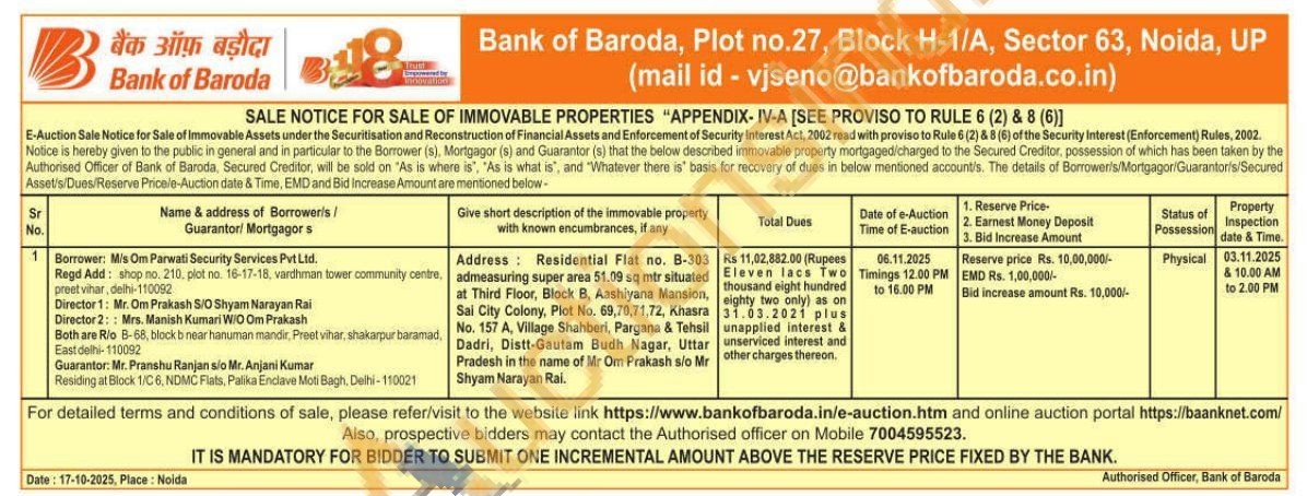 Address: Residential Flat no. B-303 admeasuring super area 51.09 sq mtr situated at Third Floor, Block B, Aashiyana Mansion, Sai City Colony, Plot No. 69,70,71,72, Khasra No. 157 A, Village Shahberi, Pargana & Tehsil Dadri, Distt-Gautam Budh Nagar, Uttar Pradesh in the name of Mr Om Prakash s/o Mr Shyam Narayan Rai.