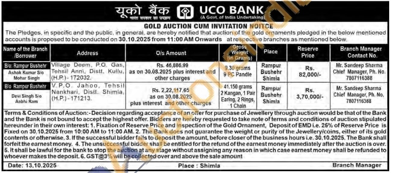 UCO Bank Gold Auctions Auction in Shimla