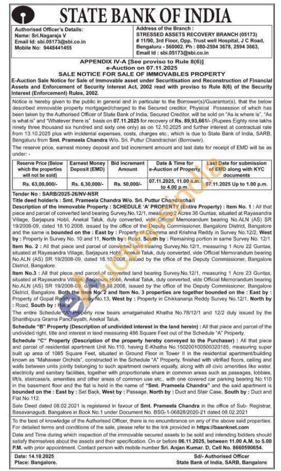 Item No. 1: All that piece and parcel of converted land bearing Survey. No. 12/1, measuring 2 Acres 36 Guntas, situated at Rayasandra Village, Sarjapura Hobli, Anekal Taluk, duly converted, vide Official Memorandum bearing No ALN (AS) SR 19/2008-09, dated 18.10.2008, issued by the office of the Deputy Commissioner, Bangalore District, Bangalore and the same is bounded on the East by: Property of Obamma and Krishna Reddy in Survey No. 12/2, West by: Property in Survey No. 10 and 11, North by: Road, South by: Remaining portion in same Survey No. 12/1. Item No. 2: All that piece and parcel of converted land bearing Survey. No. 12/1, measuring 1 Acre 22 Guntas, situated at Rayasandra Village, Sarjapura Hobli, Anekal Taluk, duly converted, vide Official Memorandum bearing No.ALN (AS) SR 19/2008-09, dated 18.10.2008, issued by the office of the Deputy Commissioner, Bangalore District, Bangalore.