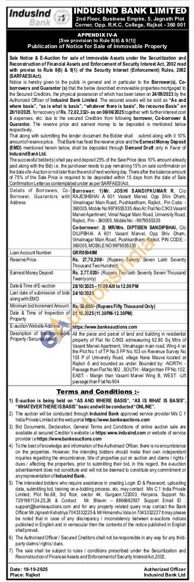 All the piece and parcel of land and building in residential pmperty of Flat No C1903 admeasuring 62.80 Sq Mirs of Vasant Marvel Apartment. Vimalnager main road. Wing 4 on the Plot No. 1 of TP No.5-FP No. 103 on Revenue Survey No 103 P of University Road, village Nana Mauva located al Rajkot 6 and bounded as under. Bounded by: NORTH-Passage than Flat No 902, SOUTH: Margin than FP No.102. EAST Margin than Vasant Marvel Wing B. WEST: -uft passage than Flat No 904