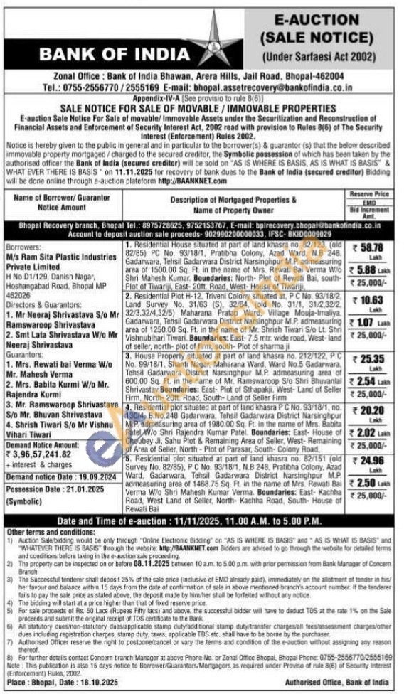 3. House Property situated at part of land khasra no. 212/122. PC No. 99/18/1. Shanti Nagar, Maharana Ward, Ward No.5 Gadarwara, Tehsil Gadarwara District Narsinghpur M.P. admeasuring area of 600.00 Sq. Ft. in the name of Mr. Ramswaroop Sio Shri Bhuvanlal Shrivastav Boundaries: East- Plot of Sthapakji, West-Land of Seller Firm, North-20ft. Road, South-Land of Seller Firm
