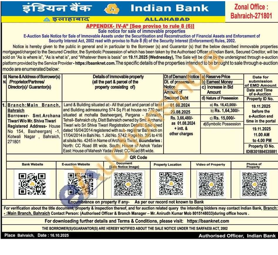 Land & Building situated at:-All that part and parcel of land and Building admeasuring 574 Sq Ft at house no 770 part situated at mohalla Basheerganj, Pargana - Bahraich, Tehsil-Bahraich city, Distt Bahraich owned by Smt. Archana Tiwari w/o Sri Shiva Tiwari Registration Details: Sale deed dated 16/04/2014 registered with sub-registrar Bahraich on 17/04/2014 in Bahi No. 1 Jild No. 5742, Page No. 395 to 416 at silsila No. 4245 in Name of Archana Tiwari, Boundaries: North: CC Road 8ft wide. South: House of Ashok Yadav East: House of Mahesh Yadav West: CC Road 8ft wide.