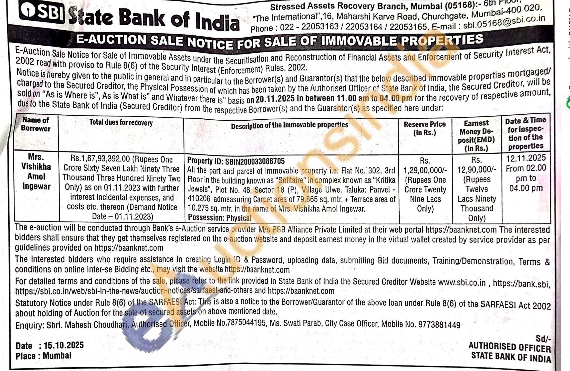 Contact Shri. Mahesh Choudhari, Authorised Officer, Mobile No.7875044195, Ms. Swati Parab, City Case Officer, Mobile No. 9773881449