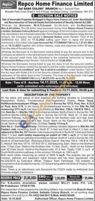 DESCRIPTION OF THE PROPERTY : All the piece and parcel of land together with building situated at Coimbatore Registration District, Thondamuthur Sub-Registration District, Perur Taluk, Kalikkanaickenpalayam Village, comprised in Survey No. 127/2, Punj. Hec. 0.32.0 or Punj. Acre 0.79, in the layout Sri Venkateshwara Avenue, in this Site No.156 measuring 3731 sq.ft. has been sub-divided as Site Nos. 156-A, 156-8 & 156-C, in this: Item No.1-Site No. 156-C is bounded as follows: North of land in Survey No. 148 South of: Site No. 1568, East of: land in Survey No. 127/18. West of: 13 feet wide common Pathway. Admeasuring, East: West on the Northern side: 42.3 feet. East: West on the Southern side: 46.9 feet, South: North on the Eastern side: 26.6 feet. South: North on the Western side: 23.6 feet, Totally 1114 sq.ft.