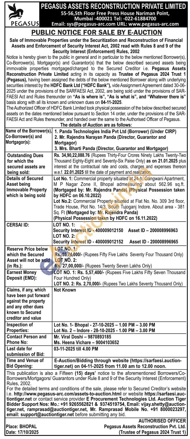 Lot No.2: Commercial Property situated at Flat No. No. 309 3rd floor, Trade House, Plot No. 14/3, South Tujoganj Indore. About area 381 Sq. Ft (Mortgaged by: Mr. Rajendra Panda) (Physical Possession taken by HDFC on 16.11.2022)