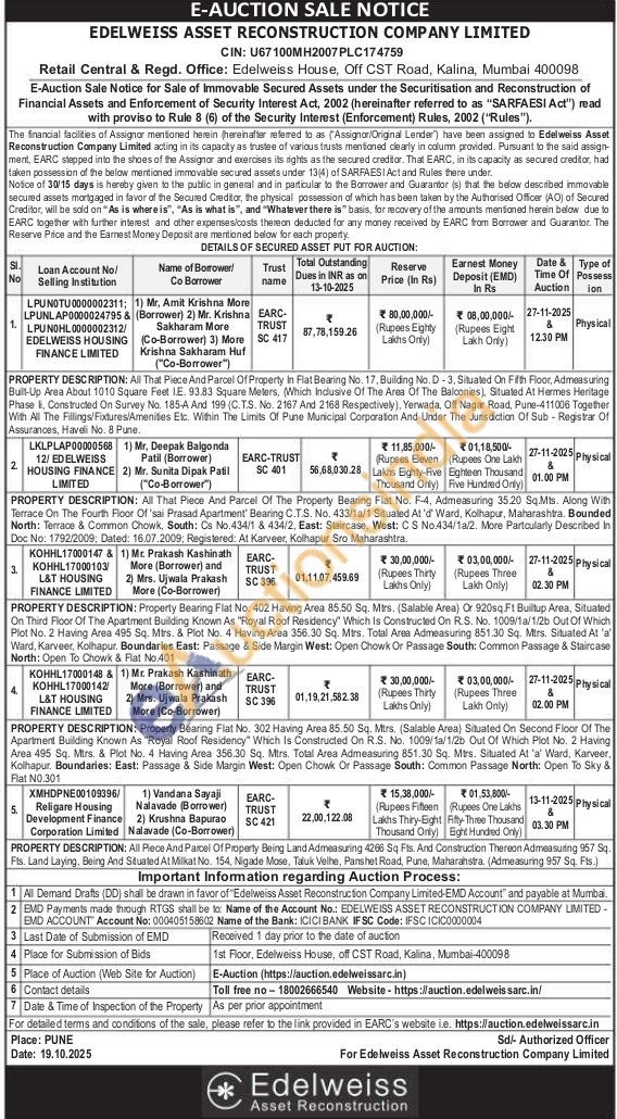 3) Property Bearing Flat No. 402 Having Area 85.50 Sq. Mtrs. (Salable Area) Or 920sq.Ft Builtup Area, Situated On Third Floor Of The Apartment Building Known As "Royal Roof Residency Which Is Constructed On R.S. No. 1009/1a/1/2b Out Of Which Plot No. 2 Having Area 495 Sq. Mirs. & Plot No. 4 Having Area 356.30 Sq. Mtrs. Total Area Admeasuring 851.30 Sq. Mtrs. Situated At 'a' Ward, Karveer, Kolhapur. Boundaries East: Passage & Side Margin West: Open Chowk Or Passage South: Common Passage & Staircase North: Open To Chowk & Flat No.401