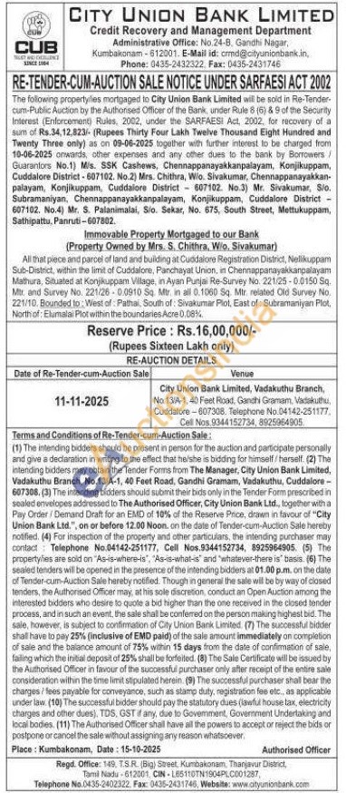 All that piece and parcel of land and building at Cuddalore Registration District, Nelikuppam Sub-District, within the limit of Cuddalore, Panchayat Union, in Chennappanayakkanpalayam Mathura, Situated at Konjikuppam Village, in Ayan Punjai Re-Survey No. 221/25-0.0150 Sq. Mtr. and Survey No. 221/26 0.0910 Sq. Mtr. in all 0.1060 Sq. Mir. related Old Survey No. 221/10. Bounded to West of: Pathai, South of: Sivakumar Plot, East of: Subramaniyan Plot, North of: Elumalai Plot within the boundaries. Acre-0.08%