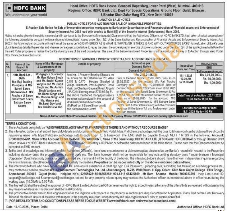 Item No. 1 Property Bearing Khasara no 94, Khata No. 141. Khasra No. 201 Area 0.453 & 0.470 Hectare Situated at Village- Bilkhaura. Post-Sujanpur, Tehsil Khair on Chadaus Gaumat Road, Aligarh U.P 202141 having area 48760.92 Sq. Ft. The above mentioned mortgaged assets are cross collateralized in the account of M/s Saheli Saree Showroom &