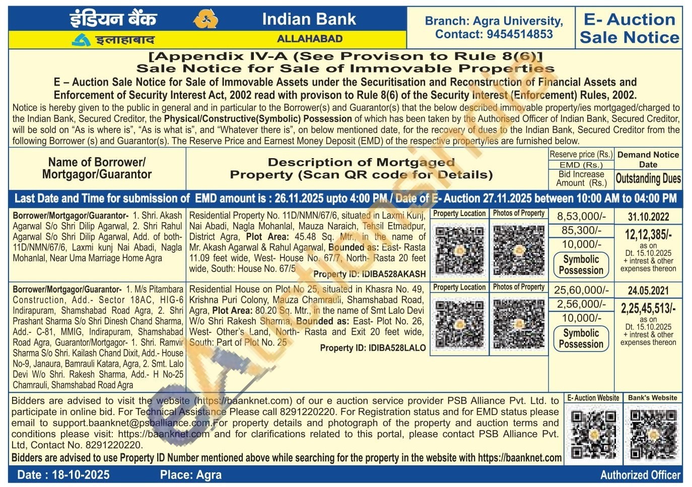 Residential House on Plot No 25, situated in Khasra No. 49, Krishna Puri Colony, Mauza Chamrauli, Shamshabad Road, Agra, Plot Area: 80.20 Sq. Mtr., in the name of Smt Lalo Devi W/o Shri Rakesh Sharma, Bounded as: East- Plot No. 26, West- Other's Land, North- Rasta and Exit 20 feet wide, South: Part of Plot No. 25