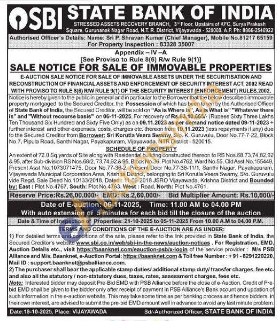 An extent of 72.0 Sq yards of Site along with Residential building constructed thereon to RS Nos. 68,73,74,82,92 & 95, after Sub-division RS Nos.68/2, 73,74,92 & 95, Block No.36, Plot No.4762, Ward No.55, Old Asst. No, 155449, Present Asst No. 1073071475, Door No.77-36-2, Present Door No.77-36-11/1, Santhi Nagar, Payakapuram, Vijayawada Municipal Corporation Area, Krishna District, belonging to Sri Korutla Veera Swamy, Sio. Guruvulu vide Regd. Sale Deed No. 10133/2018, Dated: 11-09-2018 JSRO Vijayawada, Krishna District and Bounded by: East: Plot No 4767, South: Plot No.4763, West: Road, North: Plot No.4761