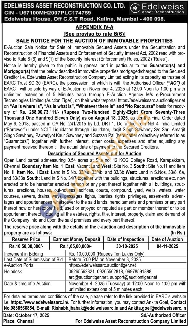 Description of Secured Assets put for Auction Open Land parcel admeasuring 0.54 acres at Site no. 12 KCG College Road, Karapakkam, Chennai Boundary Item No. 1 East: Vacant Land West: Site No. 3 South: Site No.11 and Item No. II. Item No. II East: Land in S.No. 33/4a, 33/4b, and 33/3b West: Land in S.Nos. 33/8, 6a, and 33/33a South: Land in S.No. 34/7 together with the buildings, structures, erections etc. now erected or to be hereafter erected hereon or any part thereof together with all buildings, struc-tures, erections, houses, out-houses, edifices, courts, compound, yard, wells, waters, water courses, sewers, drains, ways, passages, lights, liberties, rights, privileges, easements, advan-tages and appurtenances whatsoever to the said lands, hereditaments and premises or any part thereof now or heretofore held, used or enjoyed or reputed as part or member thereof or to be appurtenant thereto including all the estates, rights, title, interest, property, claim and demand of the Company into and upon the said premises and every part thereof