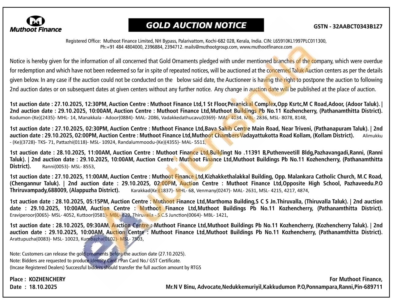 Muthoot Finance Ltd Gold Auctions Auction in Kozhikode