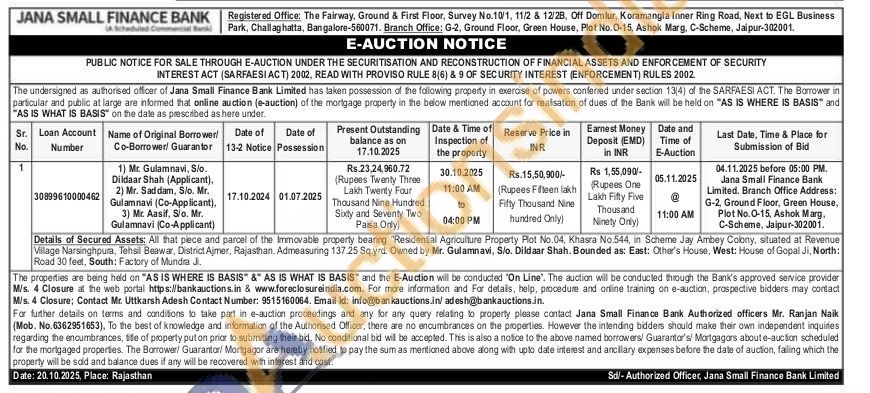 All that piece and parcel of the Immovable property bearing "Residential Agriculture Property Plot No.04, Khasra No.544, in Scheme Jay Ambey Colony, situated at Revenue Village Narsinghpura, Tehsil Beawar, District Ajmer, Rajasthan. Admeasuring 137.25 Sq.yrd. Owned by Mr. Gulamnavi, S/o. Dildaar Shah. Bounded as: East: Other's House, West: House of Gopal Ji, North: Road 30 feet, South: Factory of Mundra Ji