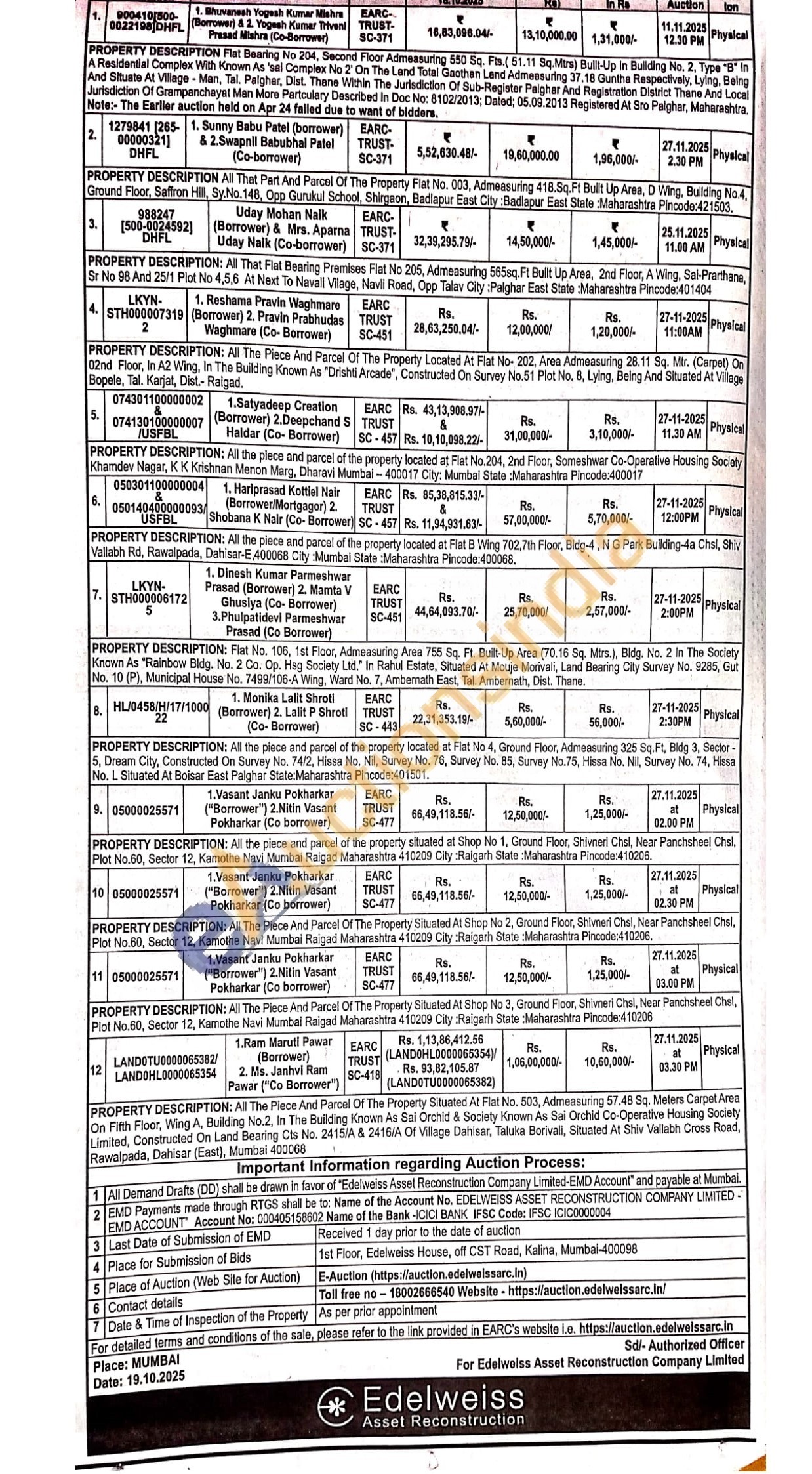 Flat Bearing No 204, Second Floor Admeasuring 550 Sq. Fts. (51.11 Sq.Mtrs) Built-Up In Building No. 2, Type "B" In A Residential Complex With Known As 'sai Complex No 2' On The Land Total Gaothan Land Admeasuring 37.18 Guntha Respectively, Lying, Being And Situate At Village Man, Tal. Palghar, Dist. Thane Within The Jurisdiction Of Sub-Register Palghar And Registration District Thane And Local Jurisdiction Of Grampanchayat Man More Partculary Described In Doc No: 8102/2013; Dated; 05.09.2013 Registered At Sro Palghar, Maharashtra. Note:- The Earlier auction held on Apr 24 failed due to want of bidders