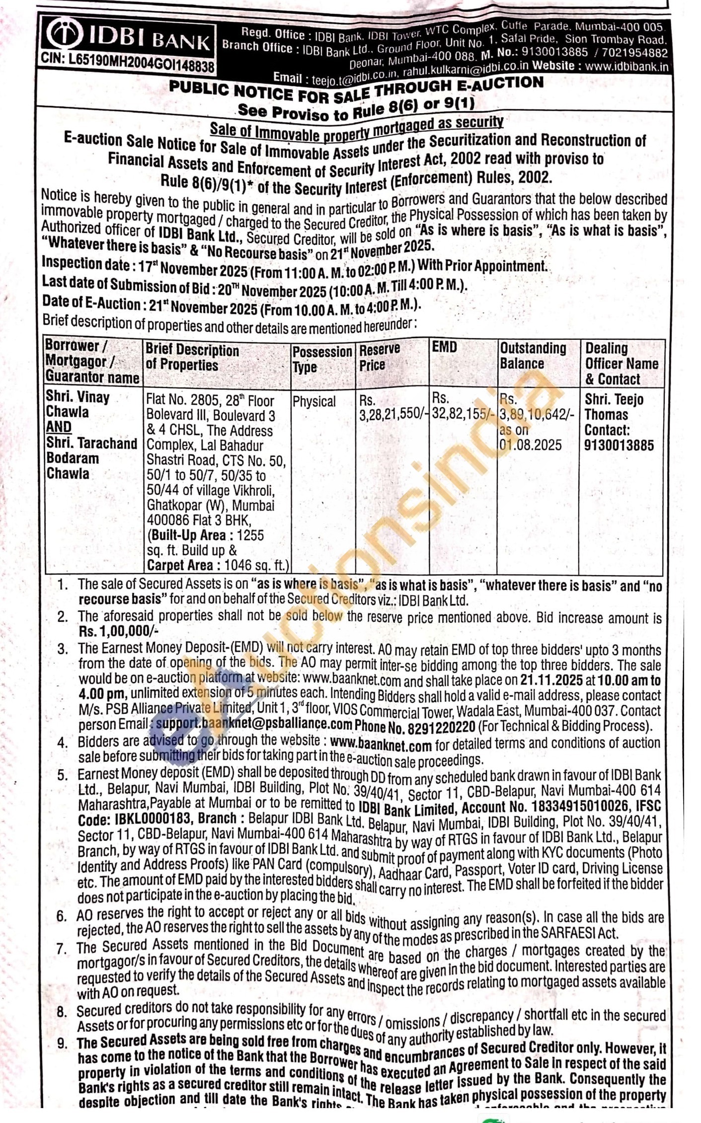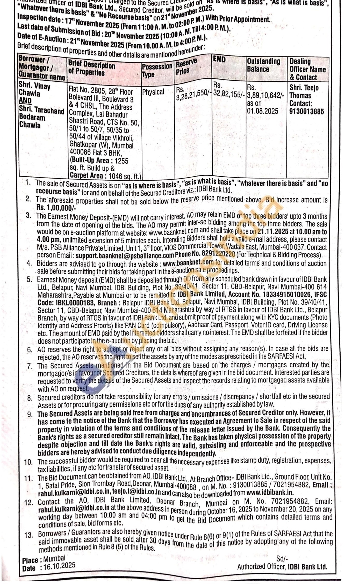 Flat No. 2805, 28 Floor Bolevard III, Boulevard 3 & 4 CHSL, The Address Complex, Lal Bahadur Shastri Road, CTS No. 50, 50/1 to 50/7, 50/35 to 50/44 of village Vikhroli, Ghatkopar (W), Mumbai 400086 Flat 3 BHK, (Built-Up Area: 1255 sq. ft. Build up &