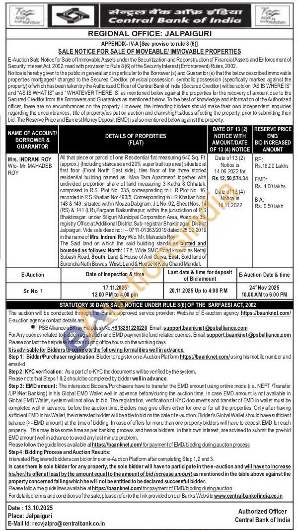 All that piece or parcel of one Residential flat measuring 640 Sq. Ft. (approx.) (Including staircase and 20% super builtup area) situated at first floor (Front North East side), tiles floor of the three storied residential building named as "Maa Tara Apartment together with undivided proportion share of land measuring 3 Katha 8 Chhatak, comprised in R.S. Plot No: 335, corresponding to L R Plot No: 16. recorded in RS Khatian No: 493/5, Corresponding to LR Khatian Nos: 148 & 149; situated within Mouza Dabgram, JLNo:02, Sheet Nos. 14 (RS) & 141 (LR), Pargana Bakunthapur, within the jurisdiction of PS Bhaktinagar, under Siliguri Municipal Corporation Area, Ward no 35. registry Office at Additional District Sub-registrar Bhaktinagar, District Jalpaiguri. Vide sale deed no: 1-0711-01363/20 19 dated: 28.02.2019 in the name of Mrs. Indrani Roy Wio: Mr. Mahadeb Roy The Said land on which the said building stands as butted and bounded as follows: North: 17 ft. Wide SMC Road known as Netaji Subash Road, South: Land & House of Anil Guwa, East: Sold land of Surendra Nath Biswas, West: Land & House of Kala Chand Mandal.