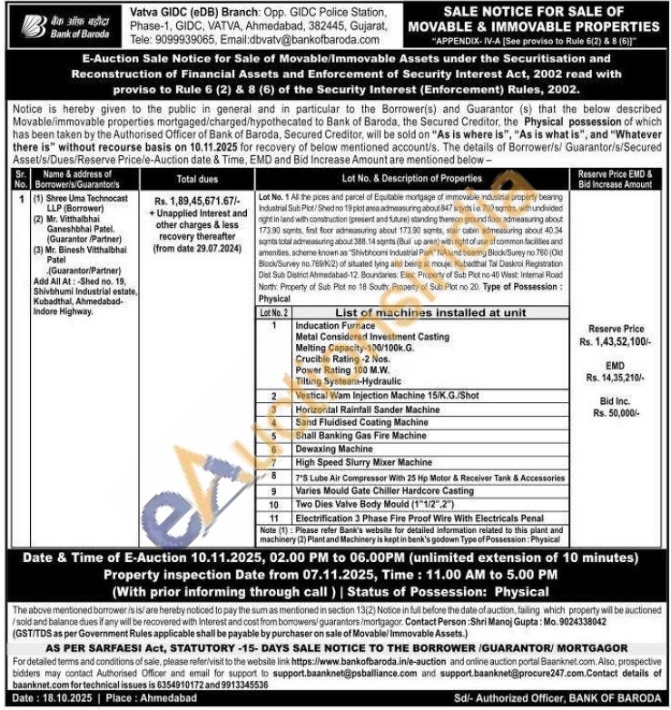 Lot No. 1 All the pices and parcel of Equitable mortgage of immovable industrial property bearing Industrial Sub Plot/Shed no 19 plot area admeasuring about 847 sqyds i e. 709 somers, with undivided right in land with construction (present and future) standing thereon ground floor admeasuring about 173.90 sqmts, first foor admeasuring about 173.90 sgmls, stair cabin admeasuring about 40.34 sommits total admeasuring about 388.14 sqmts (Buil up area) with right of use of common facilities and amenities, scheme known as "Shivbhoomi Industrial Park" NAland bearing Blockc/Surey no. 760 (0 Block/Survey no. 78/K2) of situated lying and being at mouje: Kubadthal Tal Doskroi Registration Dist Sub District Ahmedabad-12 Boundaries: East Property of Sub Pict no 40 West Internal Road North Property of Sub Plot no 18 South: Property of Sub Plot no 20. Type of Possession: Physical
