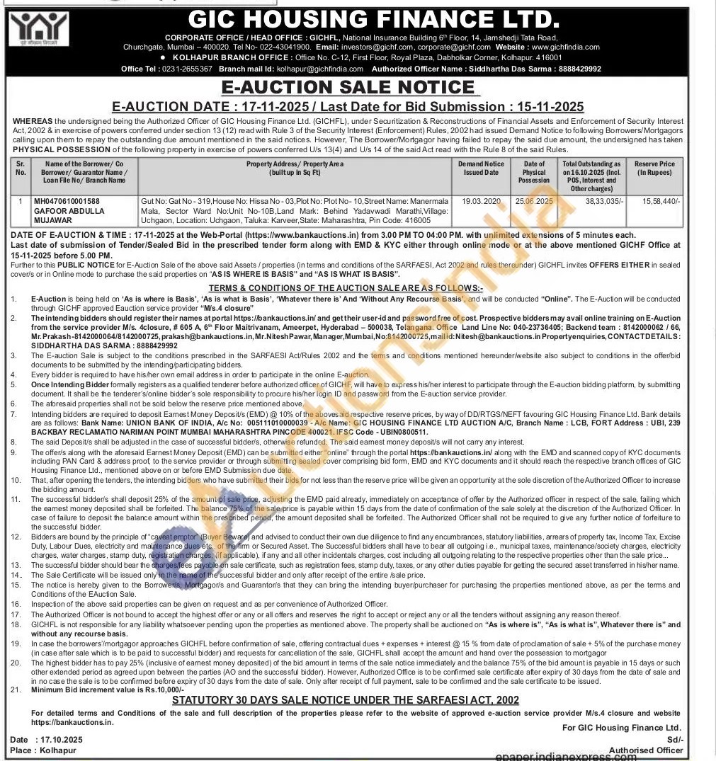 Contact mail Id: kolhapur@gichfindia.com Authorized Officer Name: Siddhartha Das Sarma: 8888429992