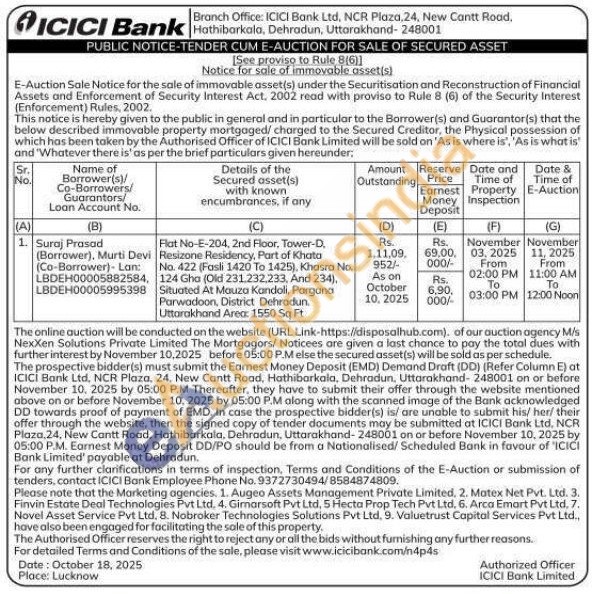 Flat No-E-204, 2nd Floor, Tower-D. Resizone Residency, Part of Khata No. 422 (Fasli 1420 To 1425), Khasra No. 124 Gha (Old 231.232,233, And 234), Situated At Mauza Kandoli, Pargana Parwadoon, District Dehradun. Uttarakhand Area: 1550 Sq Ft