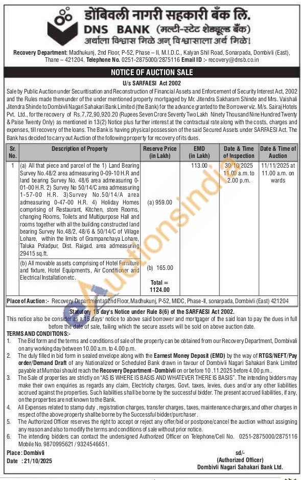 Authorized Officer on Telephone/Cell No : 02512875000 / 2875116 / Mobile No : 9870995621 / 9324546651.