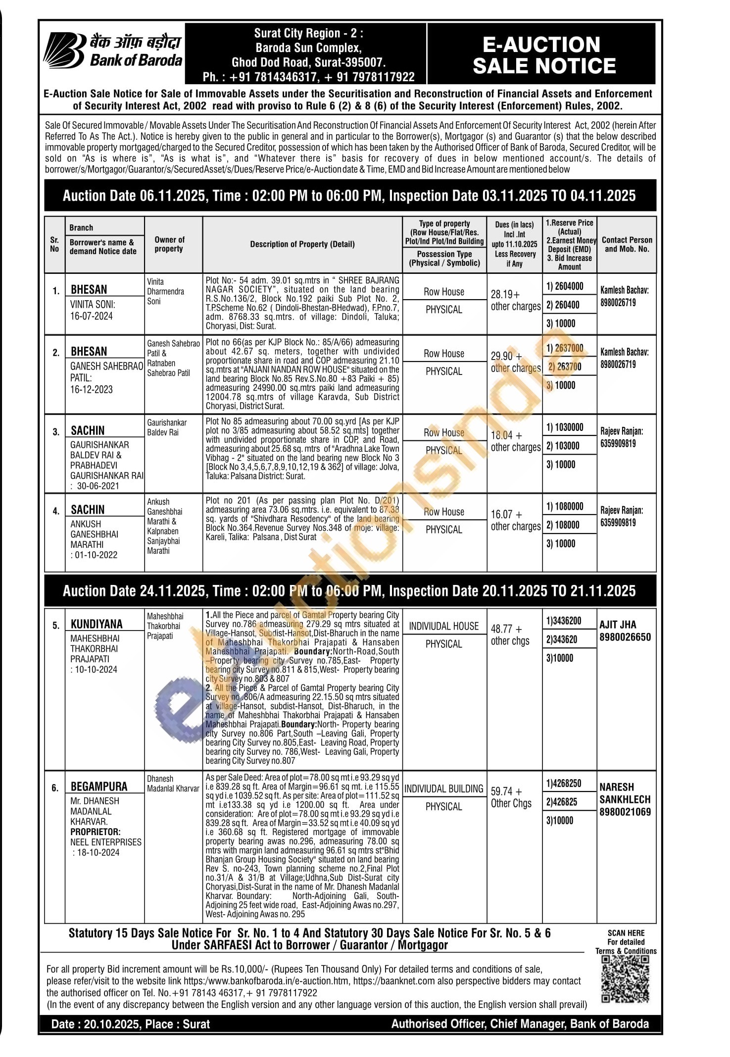 As per Sale Deed: Area of plot=78.00 sq mti.e 93.29 sq yd i.e 839.28 sq ft. Area of Margin=96.61 sq mt. i.e 115.55 sqydi.e 1039.52 sq ft. As per site: Area of plot=111.52 sq mt i.e133.38 sq yd i.e 1200.00 sq ft. Area under consideration: Are of plot 78.00 sq mt i.e 93.29 sq yd i.e 839.28 sq ft. Area of Margin=33.52 sq mt i.e 40.09 sq yd i.e 360.68 sq ft. Registered mortgage of immovable property bearing awas no.296, admeasuring 78.00 sq mtrs with margin land admeasuring 96.61 sq mtrs st"Bhid Bhanjan Group Housing Society" situated on land bearing Rev S. no-243, Town planning scheme no.2, Final Plot no.31/А & 31/B at Village; Udhna, Sub Dist-Surat city Choryasi, Dist-Surat in the name of Mr. Dhanesh Madanlal Kharvar. Boundary: North-Adjoining Gali, South-Adjoining 25 feet wide road, East-Adjoining Awas no.297. West-Adjoining Awas no. 295