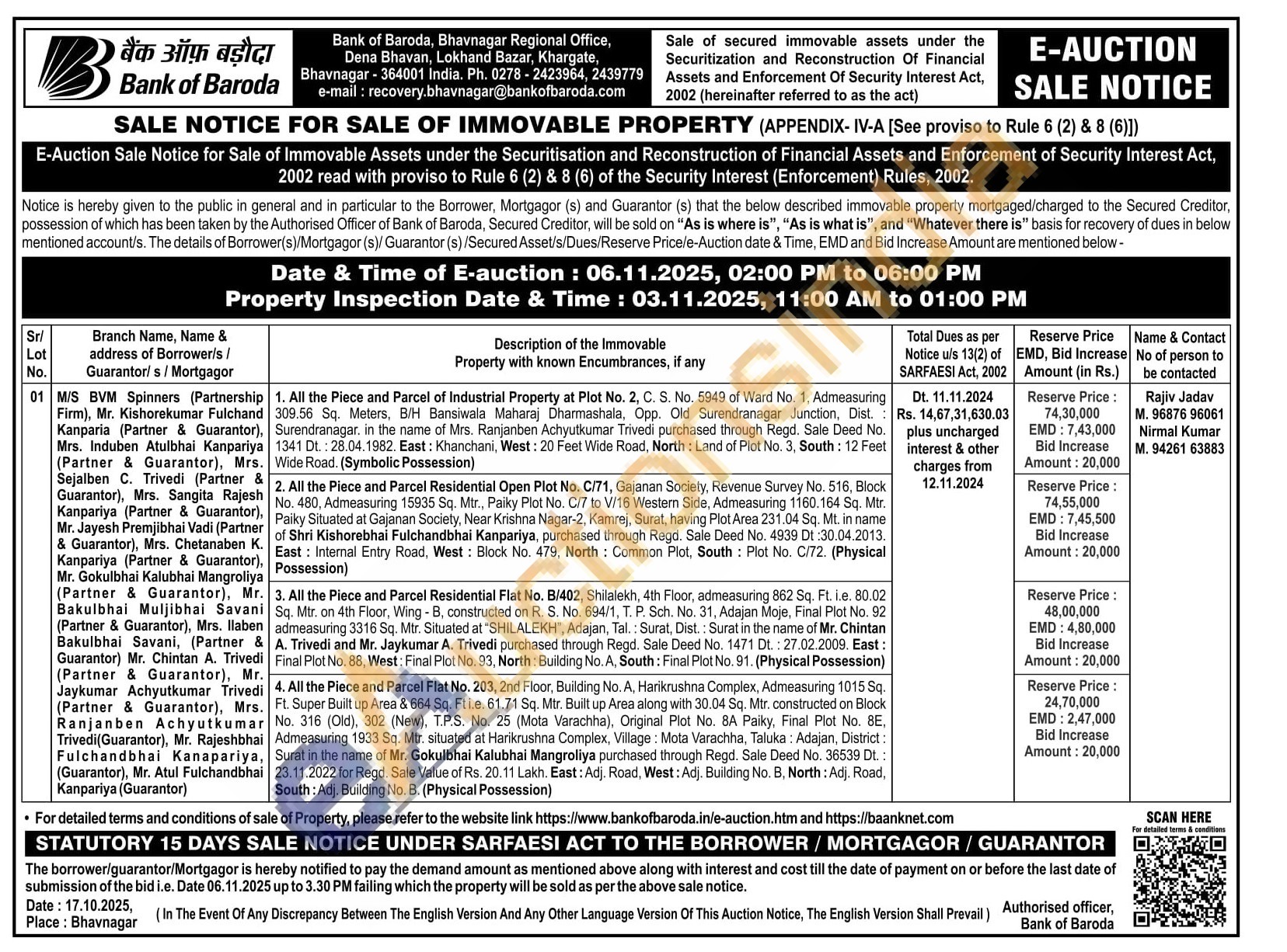 4. All the Piece and Parcel Flat No. 203, 2nd Floor, Building No. A, Harikrushna Complex, Admeasuring 1015 Sq. Ft. Super Built up Area & 664 Sq. Fti.e. 61.71 Sq. Mtr. Built up Area along with 30.04 Sq. Mtr., constructed on Block No. 316 (Old), 302 (New), T.P.S. No. 25 (Mota Varachha), Original Plot No. 8A Paiky, Final Plot No. 8E, Admeasuring 1933 Sq. Mtr. situated at Harikrushna Complex, Village: Mota Varachha, Taluka: Adajan, District: Surat in the name of Mr. Gokulbhai Kalubhai Mangroliya purchased through Regd. Sale Deed No. 36539 Dt.: 23.11.2022 for Regd. Sale Value of Rs. 20.11 Lakh. East: Adj. Road, West: Adj. Building No. B, North: Adj. Road, South: Adj. Building No. B. (Physical Possession)