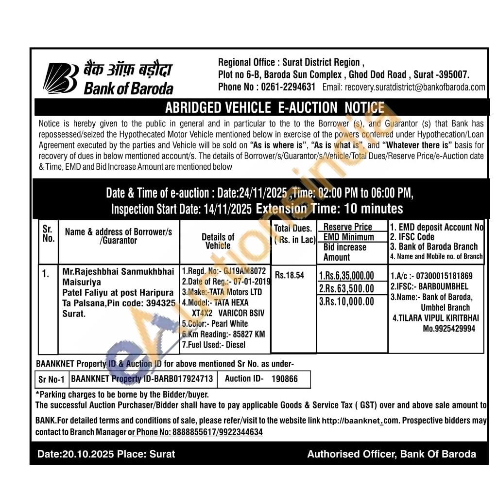 1.Regd. No:- GJ19AM8072 2.Date of Reg.:- 07-01-2019 3.Make:-TATA Motors LTD 4.Model:- TATA НЕХА XT4X2 VARICOR BSIV 5.Color: Pearl White 6.Km Reading:- 85827 KM 7.Fuel Used:- Diesel