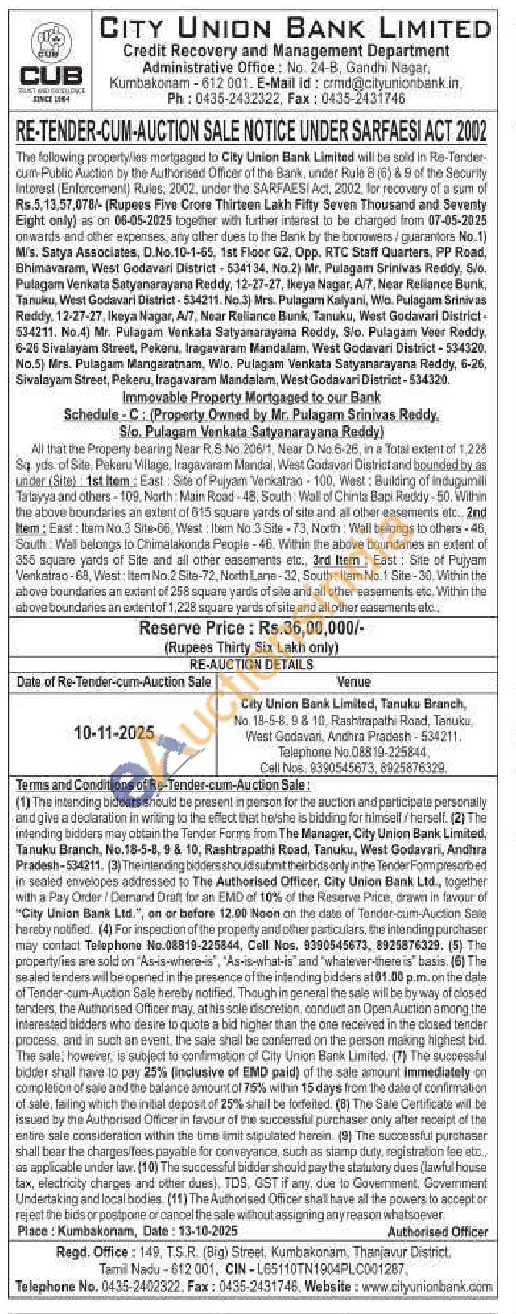 All that the Property bearing Near R.S.No.206/1, Near D No.6-26, in a Total extent of 1.228 Sq yds. of Site, Pekeru Village, Iragavaram Mandal, West Godavari District and bounded by as under (Site): 1st Item: East: Site of Pujyam Venkatrao 100, West: Building of Indugumilli Tartayya and others-109, North: Main Road-48, South Wall of Chinta Bapi Reddy-50. Within the above boundaries an extent of 615 square yards of site and all other easements etc. 2nd Item: East: Item No.3 Site-66, West: Item No.3 Site-73, North: Wall bellongs to others-46, South Wall belongs to Chimalakonda People-46. Within the above boundaries an extent of 356 square yards of Site and all other easements etc., 3rd Item: East: Site of Pujyam Venkatrao-68, West: Item No.2 Site-72, North Lane-32, South: Item No.1 Site-30. Within the above boundaries an extent of 258 square yards of site and all other easements etc. Within the above boundaries an extent of 1,228 square yards of site and all other easements etc