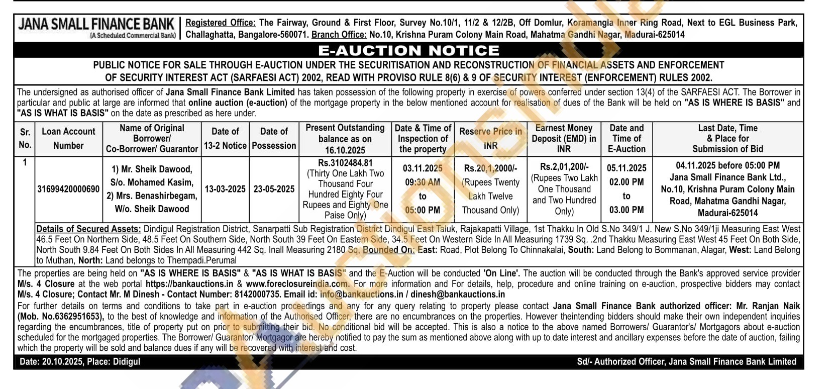 Details of Secured Assets: Dindigul Registration District, Sanarpatti Sub Registration District Dindigul East Taluk, Rajakapatti Village, 1st Thakku In Old S.No 349/1 J. New S.No 349/1ji Measuring East West 46.5 Feet On Northern Side, 48.5 Feet On Southern Side, North South 39 Feet On Eastern Side, 34.5 Feet On Western Side In All Measuring 1739 Sq. 2nd Thakku Measuring East West 45 Feet On Both Side, North South 9.84 Feet On Both Sides In All Measuring 442 Sq. Inall Measuring 2180 Sq. Bounded On: East: Road, Plot Belong To Chinnakalai, South: Land Belong to Bommanan, Alagar, West: Land Belong to Muthan, North: Land belongs to Thempadi. Perumal