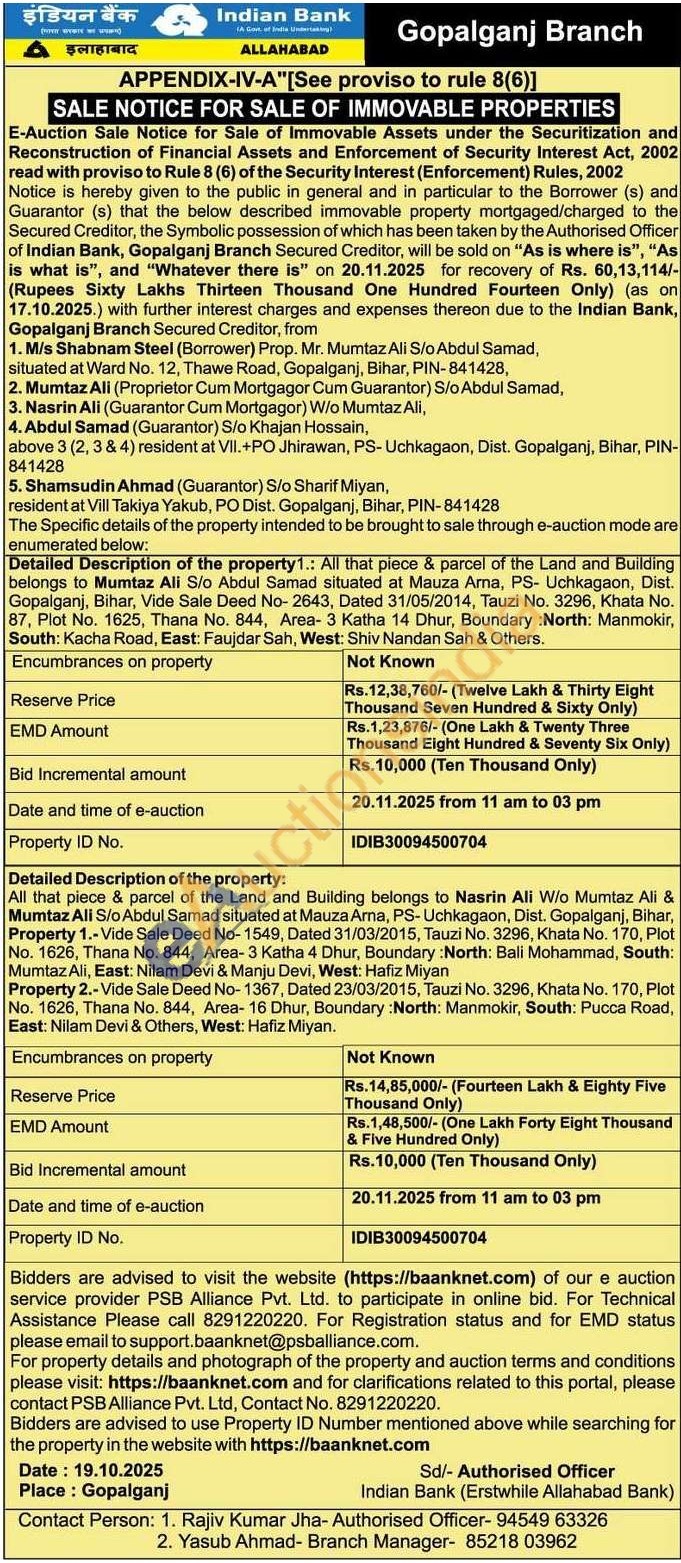 All that piece & parcel of the Land and Building belongs to Nasrin Ali W/o Mumtaz Ali & Mumtaz Ali S/o Abdul Samad situated at Mauza Arna, PS-Uchkagaon, Dist. Gopalganj, Bihar, Property 1.-Vide Sale Deed No-1549, Dated 31/03/2015, Tauzi No. 3296, Khata No. 170, Plot No. 1626, Thana No. 844, Area-3 Katha 4 Dhur, Boundary: North: Bali Mohammad, South: Mumtaz Ali, East: Nilam Devi & Manju Devi, West: Hafiz Miyan
