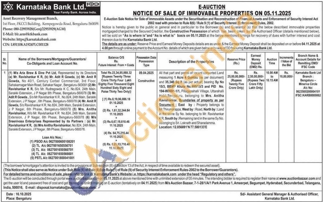 All that part and parcel of vacant converted Land measuring 1 Acre 4 Guntas (as per document) and 35,340 Sq ft (as per actual) bearing Sy No 15/3, BBMP Khata No.460/15/3 and PID No. 194-W0691-1/1, Pillaganahalli Village, Uttarahalli Hobli, Bengaluru, belonging to Mrs. Anitha Ravishankar. Boundaries of property as per Document: East by Property belongs to Mr.Thirumalappa, West by: Road, North by: Land in the same Sy No. belonging to Mr. Ravishankar KR, South by :Remaining land in the same Sy No. belonging to Sri. Loknath and Sharadamma. Location: 12.856891°N 77.580133'E