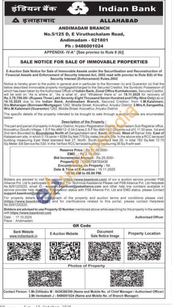 The part and parcel of property in Ariyalur District, Ariyalur Registration District, Andimadam Sub Registrar office, Koovathur (South) Village, 1 SF No 466/12-0.04.0 ares 2 SF No. 466/13-0.09 cents out of 0. 11.50 ares. 1stand 2nd item Bounded by Boundaries North of Gangachalam land, South of Road, West of Ramar Site East of Kalaiselvam site, in which 0.19 cents=8284 Sq. feet 770 Sq.meter Vacant Site In the above site a RCC terraced building measuring East West standard feet 27, North, South standard feet 29, in total 783 Sq feet 72.75 Sq Meter. EB Service No.530. In the 1st floor RCC terraced building measuring 36 Sq ft with well