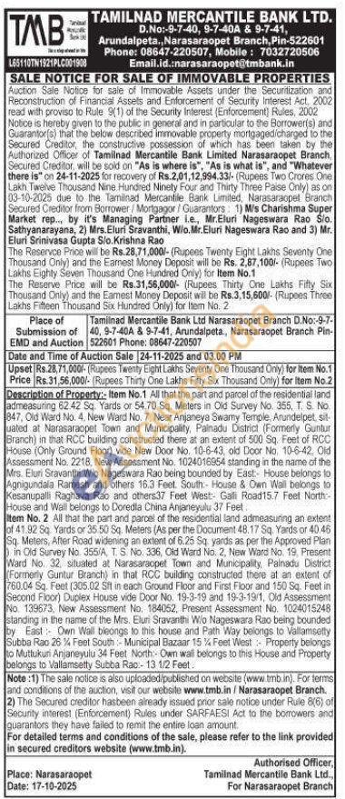 All that the part and parcel of the residential land admeasuring 62.42 Sq. Yards or 54.70 Sq. Meters in Old Survey No. 355, T. S. No 847, Old Ward No. 4, New Ward No. 7. Near Anjaneya Swamy Temple, Arundelpet, sit-uated at Narasaraopet Town and Municipality, Palnadu District (Formerly Guntur Branch) in that RCC building constructed there at an extent of 500 Sq. Feet of RCC House (Only Ground Floor) vide New Door No. 10-6-43, old Door No 10-6-42, Old Assessment No. 2218, New Assessment No. 1024016954 standing in the name of the Mrs. Elun Sravanthi Wio Nageswara Rao being bounded by East House belongs to Agnigundala Ramesh and others 18.3 Feet. South: House & Own Wall belongs to Kesanupalli Raghava Rao and others37 Feet West- Galli Road15.7 Feet North-House and Wall belongs to Doredla China Anjaneyulu 37 Feet