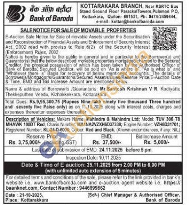 Makers Name: Mahindra & Mahindra Ltd: Model: TUV 300 T8 MHAWK 100DT Red, Chasis Number. MA1NA2VZXH6037338; Engine Number: VZH6031701; Registered Number: KL-24-0-6000: Colour Red and Black. (Known encumbrances, if any. NIL