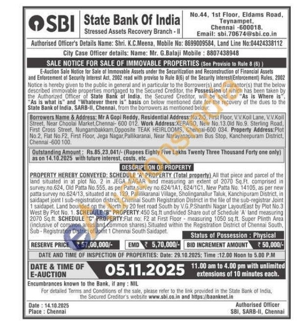PROPERTY HEREBY CONVEYED: SCHEDULE 'A' PROPERTY (Total property) All that piece and parcel of the land situated in at plot No. 2 in JEGA NAGAR land measuring an extent of 2070 Sq.Ft. comprised in survey no.624, Old Patta No.555, as per Patta survey no.624/1A1, 624/101, New Patta No. 14105, as per new patta survey no.624/13, situated at no. 129, Pallilikaranai Village, Sholinganallur Taluk, Kanchipuram District, in saidapet joint I sub-registration district, Chennai South Registration District in the file of the sub-registrar Joint 1 saidapet. Land bounded on the North by 20 feet road South by V.G.P.Shanthi Nagar LayoutEast by Plot No.3 West By Plot No. 1. SCHEDULE "B" PROPERTY:450 Sq.ft undivided Share out of Schedule A' land measuring 2070 Sq.ft. SCHEDULE "C" PROPERTY:Flat no: F2 at First Floor measuring 1050 sq.ft. Super Plinth Area (inclusive of common areas and common shares). Situated within the Registration District of Chennai South, Sub-Registration District of Joint 1 Chennai South Saidapet